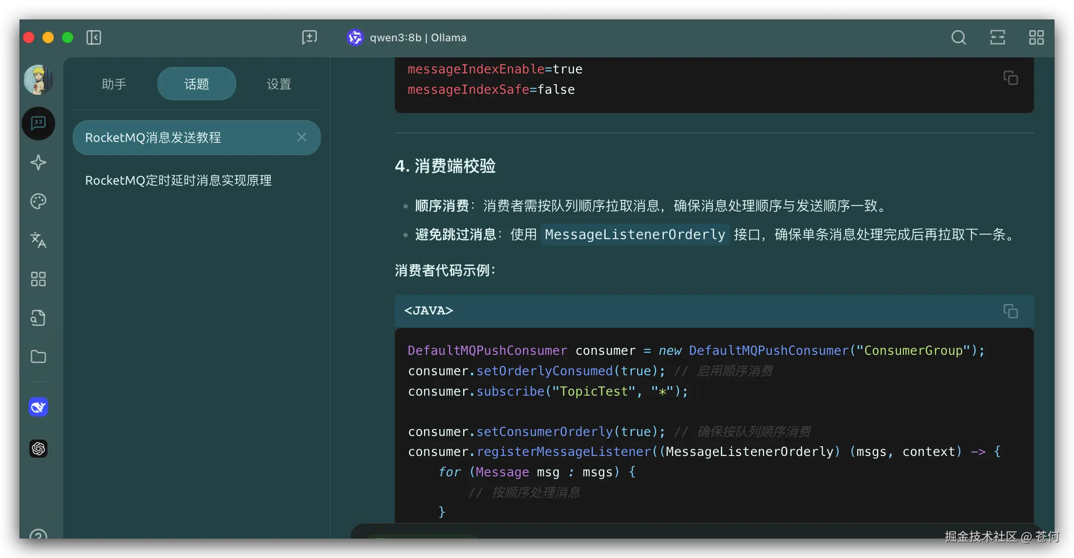 然后在模型这里选择刚部署的 Qwen3,就可以实现基于知识库的提问了。比如我的知识库里面有之前自己写的 rocketmq 专栏,他都能给我快速找到。