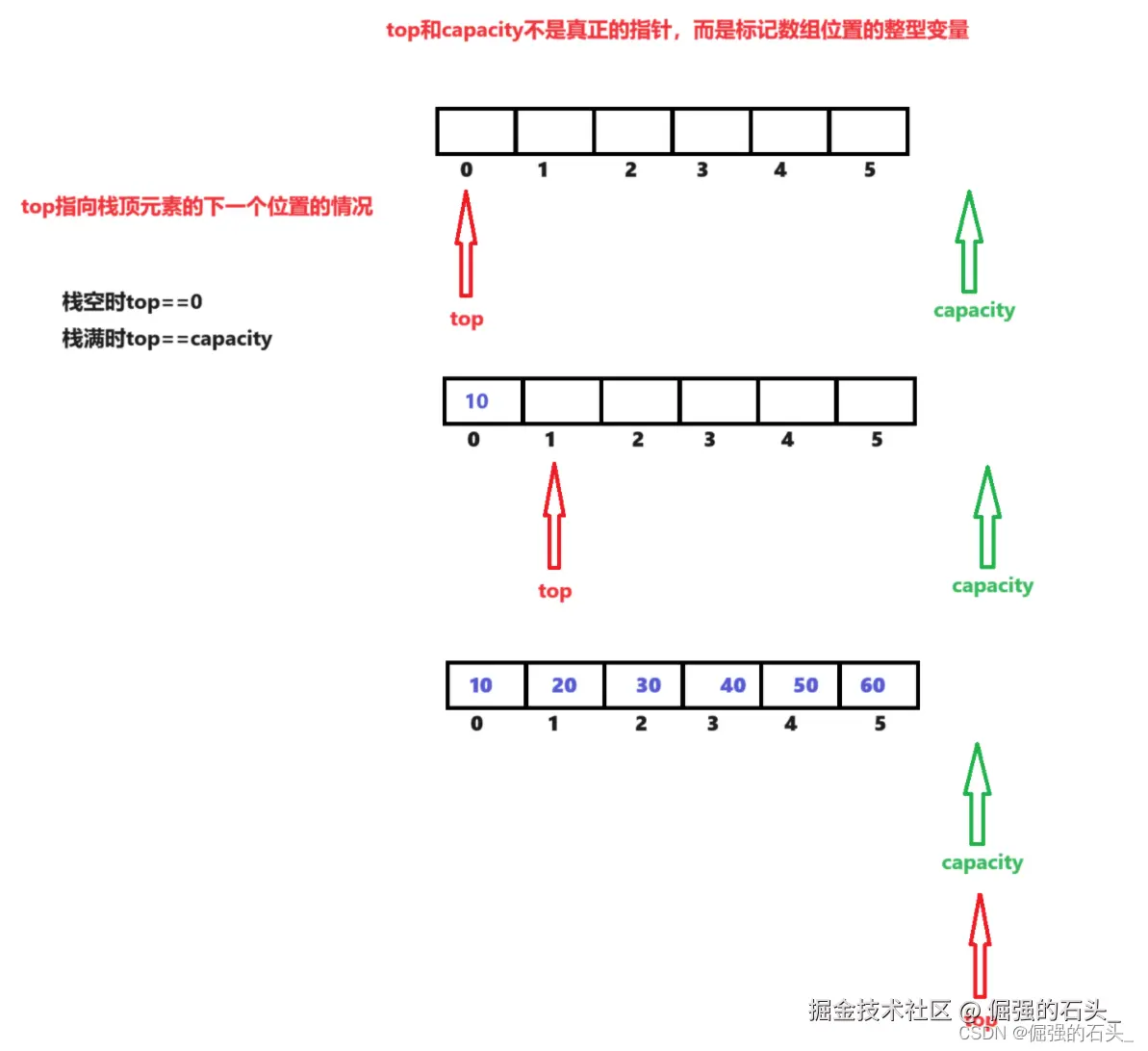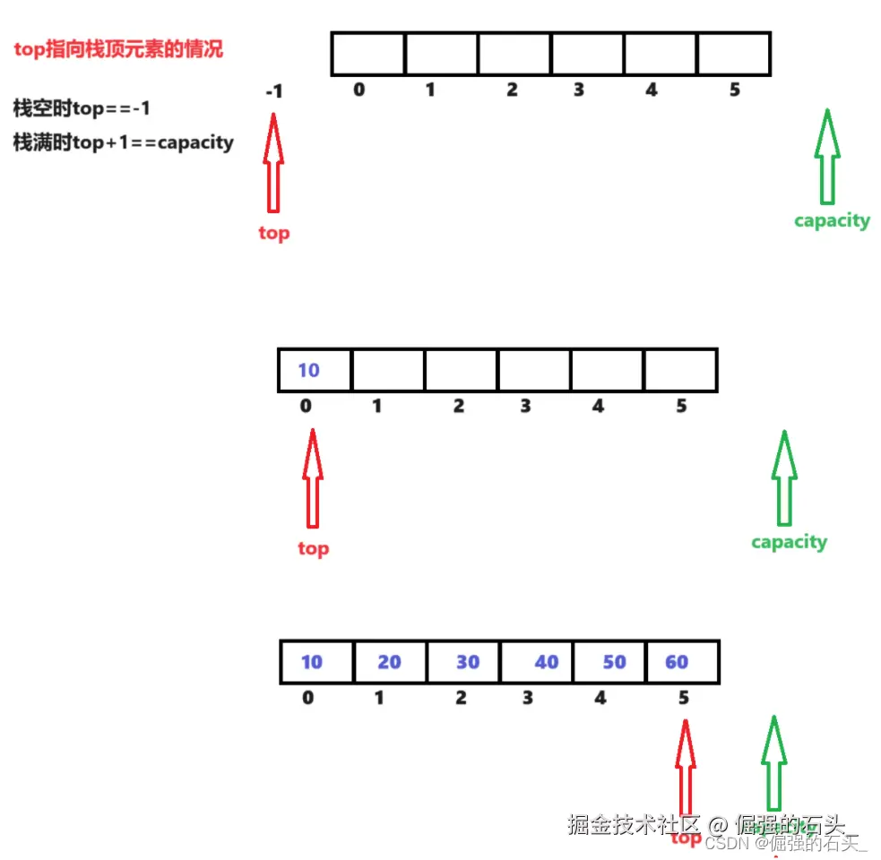 - top和capacity初始化为0(这里top指向的是栈顶元素的下一个位置)