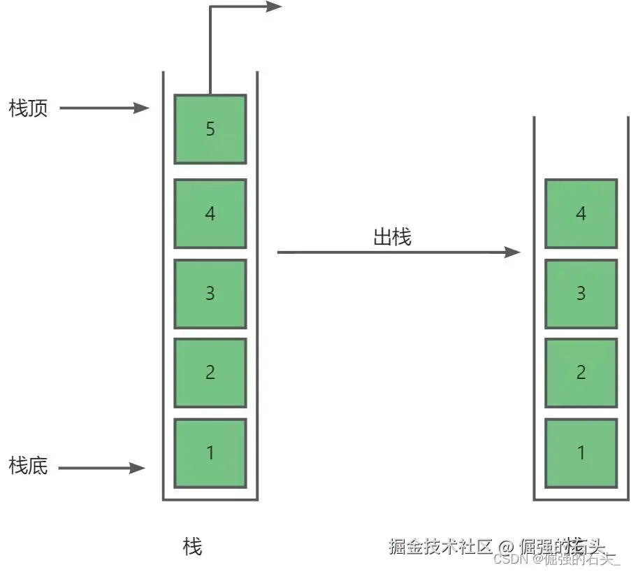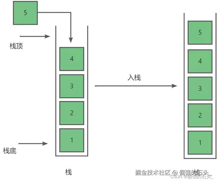 - 允许进行插入和删除操作的一端称为栈顶(top),另一端称为栈底(bottom)。