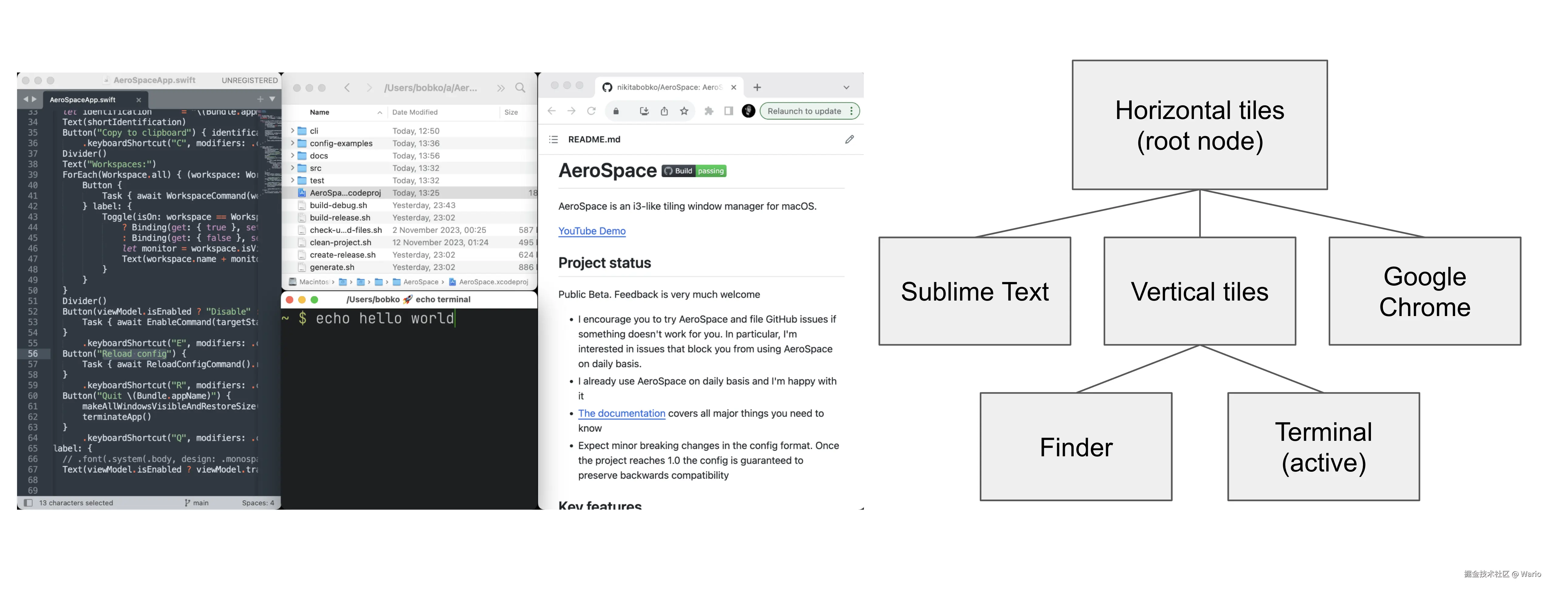 app之中来回切换,那么肯定会遇到一个头痛的问题,要高频率的使用alt+tab如果此时要切换的app数量高于2那么这个时候切换就会非常频繁且地效,所以需要一个系统化的解决方案来管理窗口之间的来回切换,而这个解决方案就是平铺窗口管理器,而今天要介绍的平铺窗口管理器就是aerospace