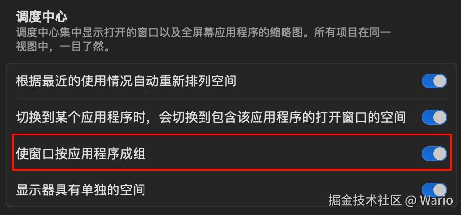 在系统设置->桌面与程序坞->调度中心 中勾选 使窗口按照应用程序成组 就可以解决了!