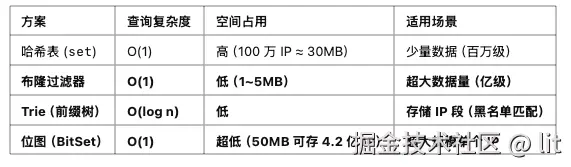 • 大规模单个 IP ✅ BitSet(存 4.2 亿 IP 仅 50MB)