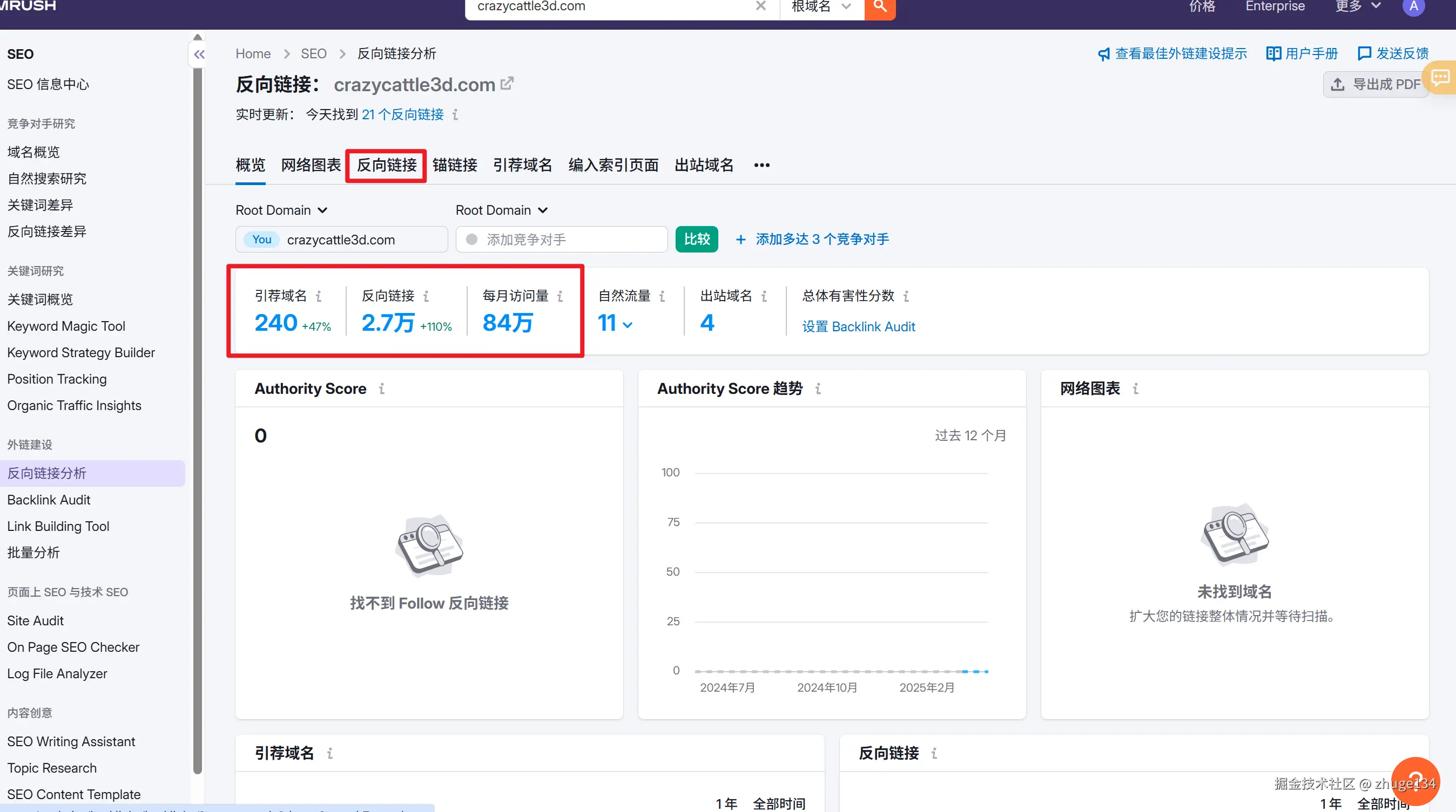 - 在semrush中,找到反向链接分析工具,输入crazycattle3d.com,首先会看到域名的概览。这里可以看到crazycattle3d.com在短短不到一个月时间内已经获取了2.7万个个外链,引荐域名也有240个,这就是为什么他能拿到排名第一,每万访问量的主要原因。