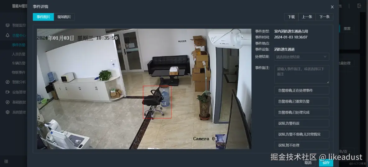 2)实时告警:AI智能分析网关V4检测到地面垃圾后,立即将告警信息上报至监控管理平台。平台通过弹窗、短信、邮件等方式,多渠道通知相关责任人,确保告警消息快速传达。