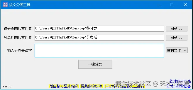 3,软件打开后,“待分类图片文件夹”选择待分类的文件夹,“分类后图片文件夹”选择要保存分类后文件的文件夹