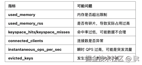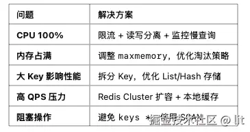 • 可能是**大 key 处理、阻塞操作(如 keys )、Lua 脚本执行时间长*。