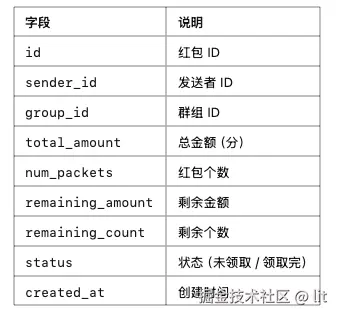 • 防刷机制:限制 单用户 1 秒内最多创建 3 个红包。