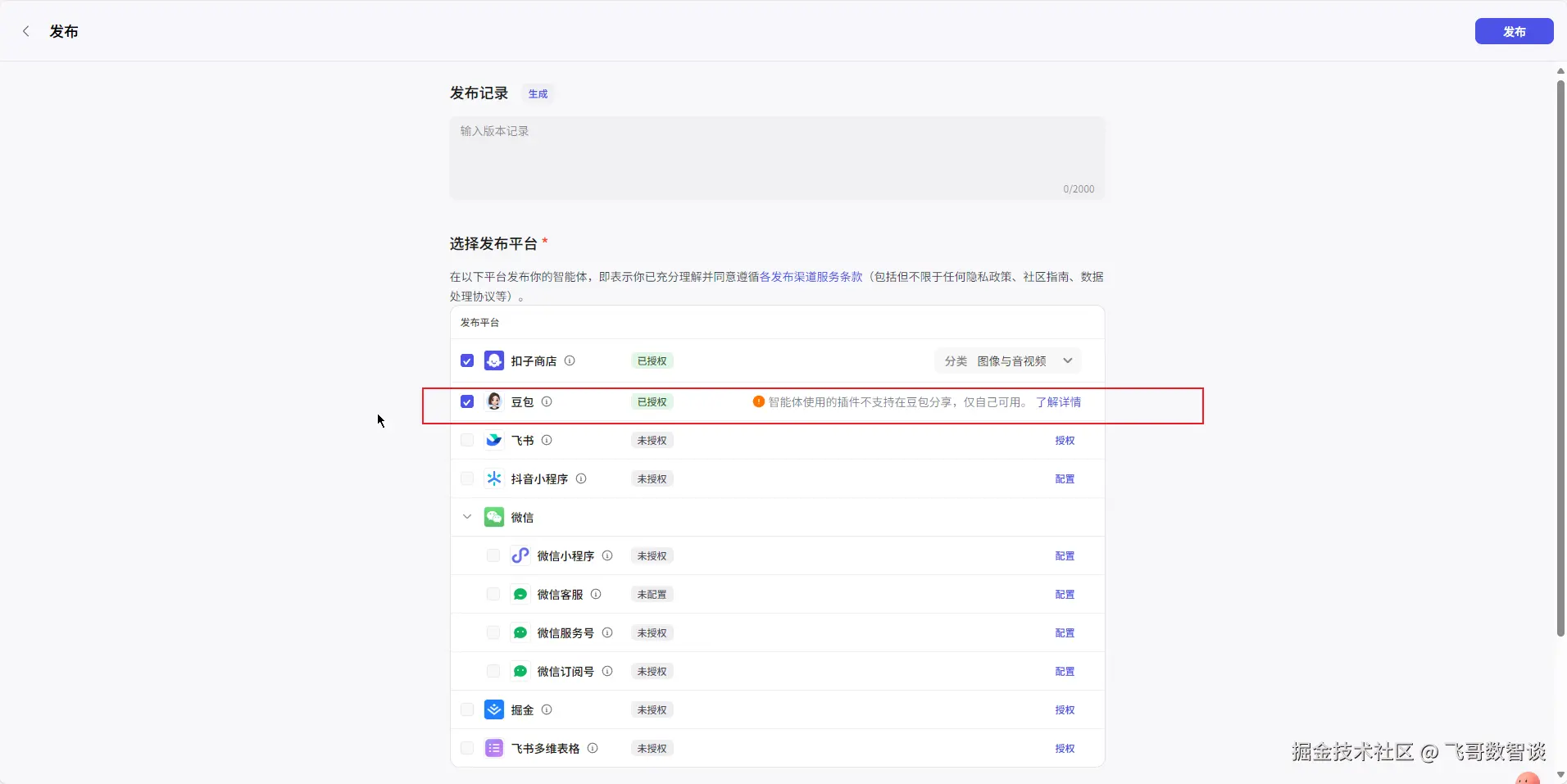 上面搭建完成的智能体,点击右上角的“发布”按钮。