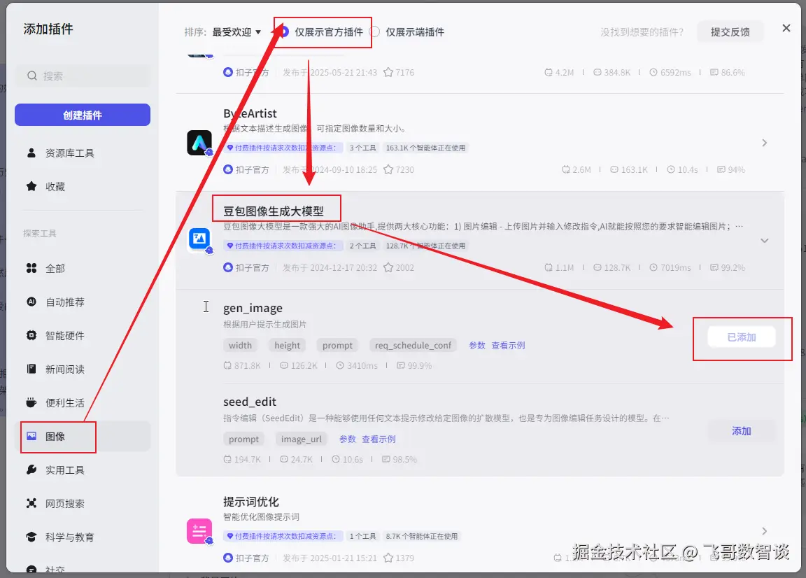 只需要一个插件“豆包图像生成大模型”,和“即梦” AI 应该是同一个技术体系的,算是国内图片生成领域的佼佼者了。