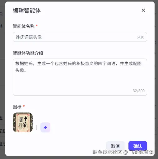 3、创建一个专用的智能体“姓氏词语头像”。