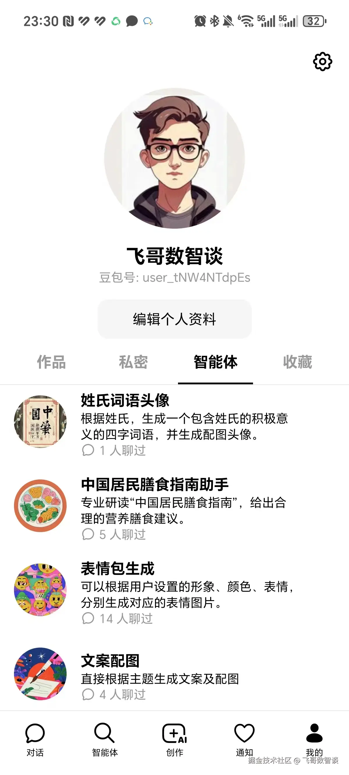 我们打开“豆包” APP, 在“我的”页面,“智能体”选项卡中,可以看到刚才发布的智能体。