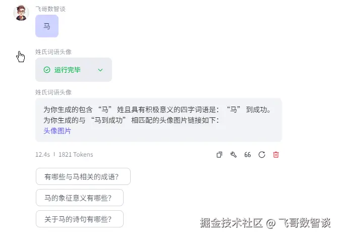 用户输入姓氏,智能体自动根据姓氏拼音生成对应的四字词语,词语含义积极向上,然后根据词语生成一张带有姓氏词语的头像图片,供用户下载使用。