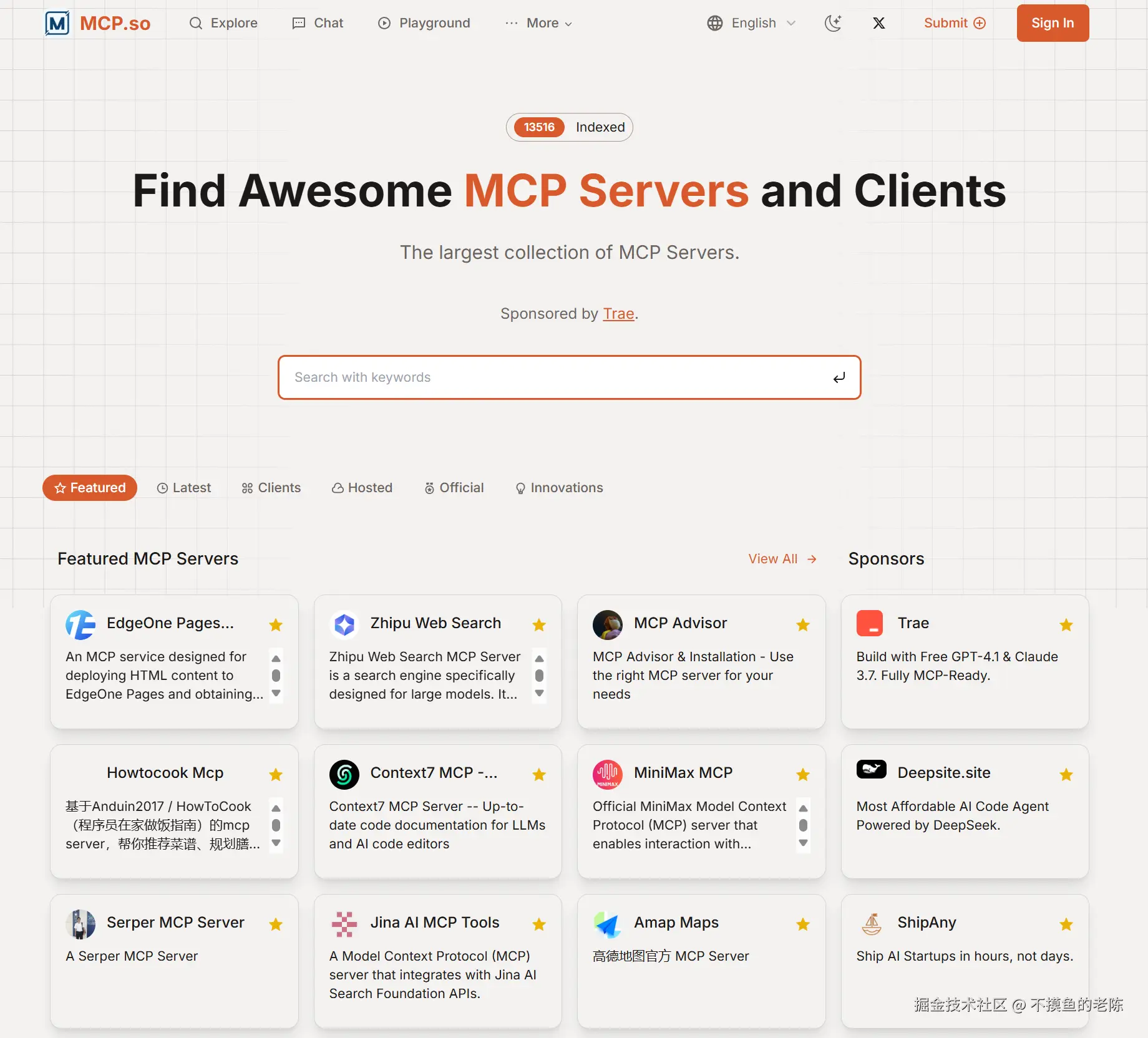 MCP.so 是一个 MCP 服务器列表网站/平台,收集了大量的 MCP 服务器,方便用户搜索和发现。
