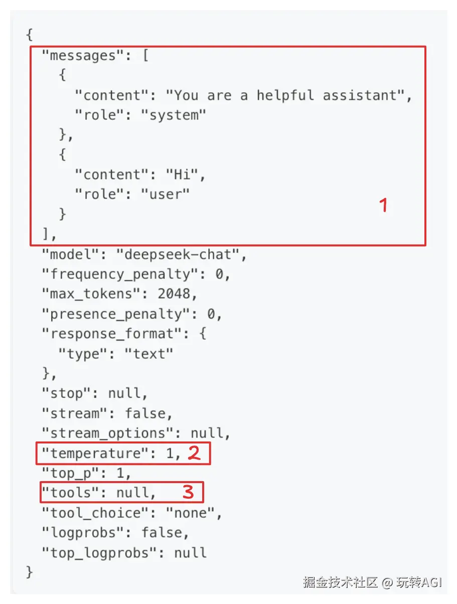 我们前面提到过大语言模型的 本质就是文字接龙 , 相对应的使用大模型也比较简单. 可以参见deepseek的文字接龙 api 请求: