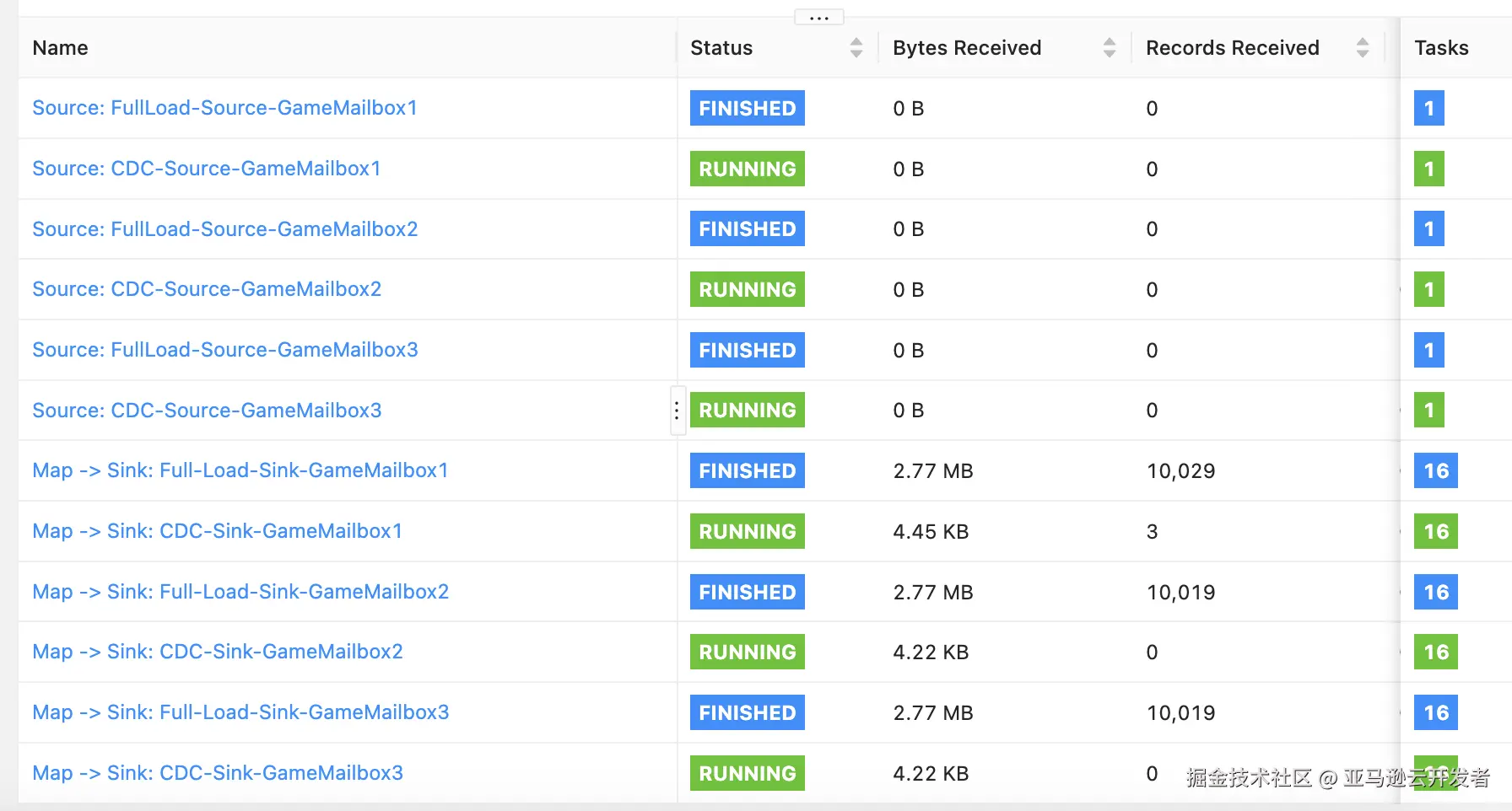 Flink UI 界面可以看到,全量 Full load 和增量 CDC 任务正常运行: