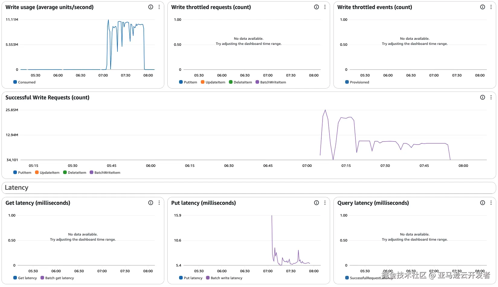 DynamoDB 指标:WCU 10M,相当于每秒写入 1 千万条 1KB 数据,写延迟 6ms,性能相当优异。