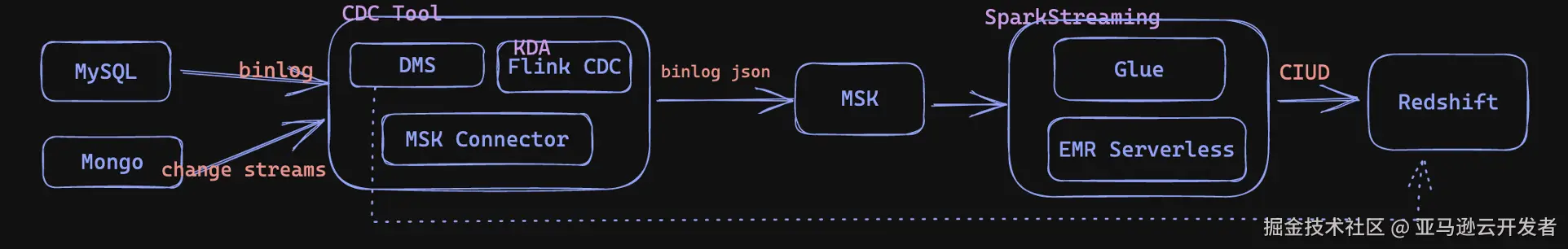 - Hive + DynamoDB Stream:Hive 支持 DynamoDB,以外表方式操作 DynamoDB 表,结合 DynamoDB Stream 可以自己编写 Lambda 处理增量变化数据。但是此方案对 map 字段支持有限,也排除考虑。