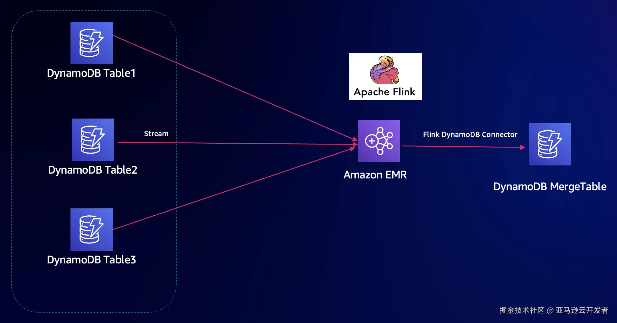 整个方案架构如下。创建 EMR Flink,编写 Flink 程序,使用 Datastream API 访问多个 DynamoDB 表,合并转换数据,写入目标 DynamoDB 表。此过程还需要获取 DynamoDB 变化并写入目标表,开启 DynamoDB Stream。