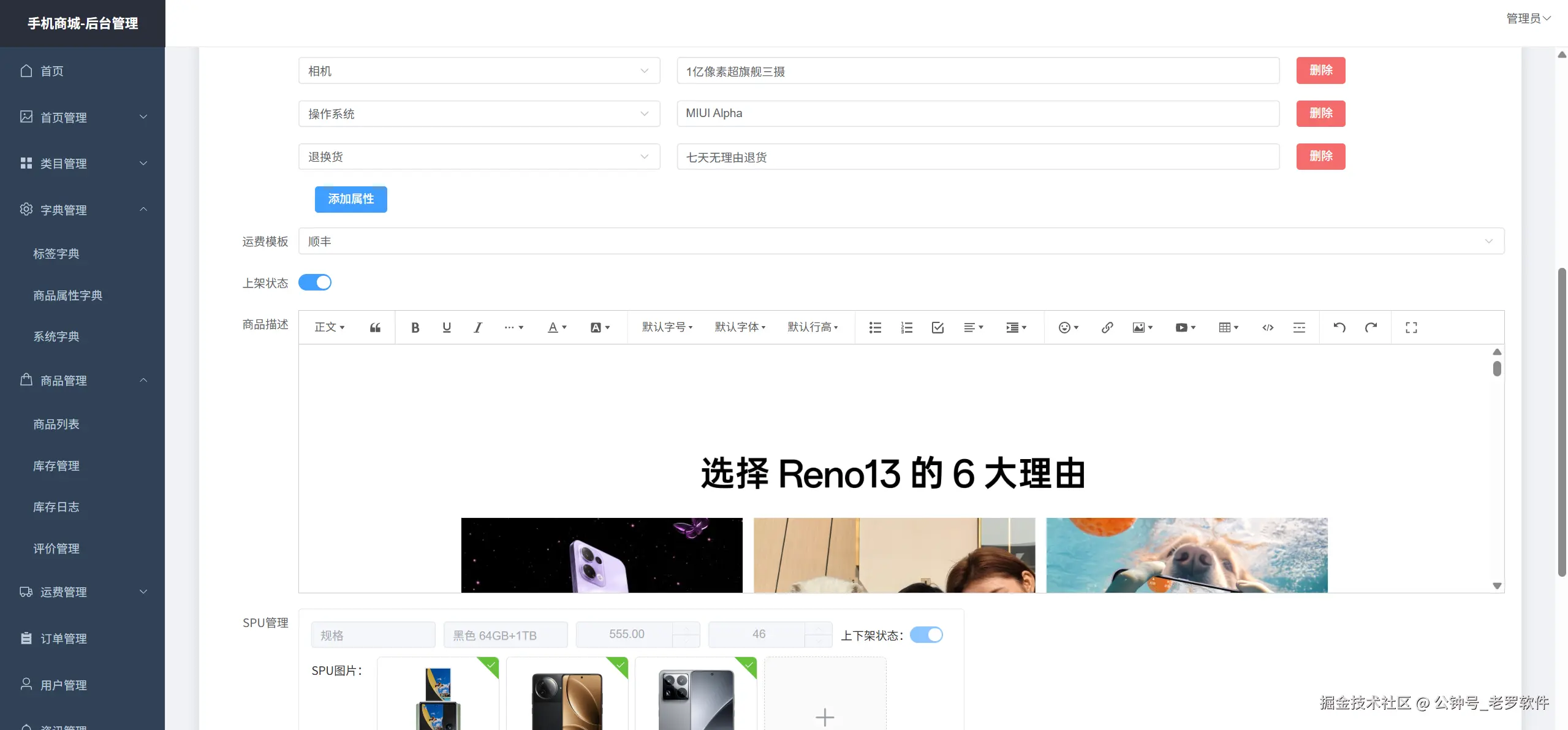 这个是系统的核心, 商品的很多属性,主要有: 手机的售卖标题,所属的分类,商品详情的动态属性,商品详情,spu等。在后台管理的商品管理里面可以对商品进行上下架,商品新增,修改,切不可删除。因为商品关联了很多表,如果不卖该商品了,只能作下架处理。