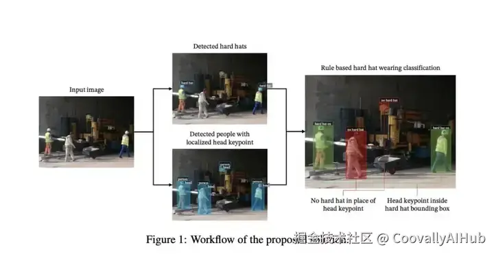 为解决基于安全帽和人员检测以及错误的局部对象分类的方案所面临的挑战,我们提出了一种基于头部关键点定位的新方法来检测安全帽佩戴者(图1)。在深度学习中,关键点被理解为图像中的兴趣点。其最大优势在于对变换不变,因此不会受缩放影响。