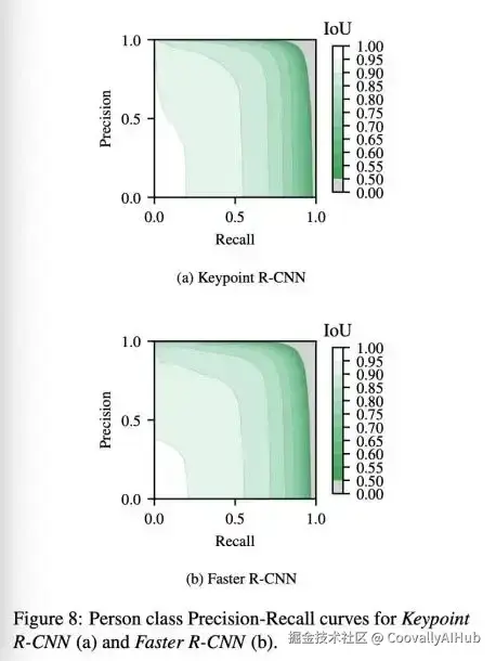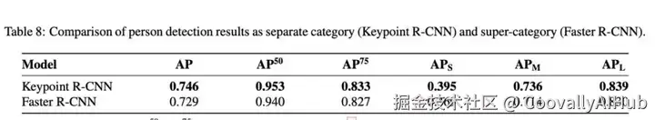 表8对比了前述Faster R-CNN模型与同步检测安全帽和人员实例的Keypoint R-CNN模型(即第4节中的X101模型)在人员检测上的表现。数据显示,当将Faster R-CNN的所有检测实例视为单一类别时,Keypoint R-CNN在人员检测上略胜一筹,但优势并不显著。值得注意的是,与掩码分支不同,增加关键点检测分支通常会降低目标检测性能,因此理论上Faster R-CNN应优于Keypoint R-CNN。