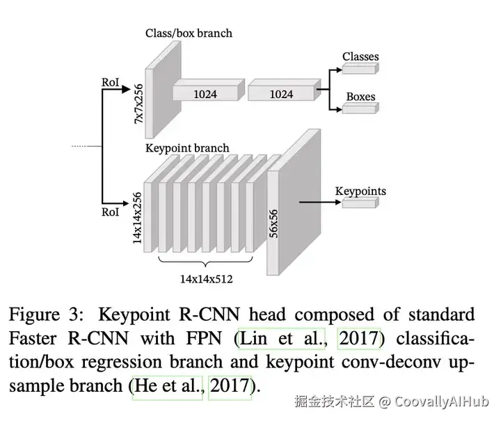 网络头部通过结合标准的Faster R-CNN与FPN分类和边界框回归分支以及关键点卷积-反卷积上采样分支构建。关键点R-CNN头部的详细架构如图3所示。