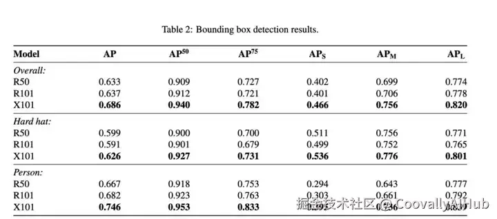 检测结果表明所有三个模型均训练良好,其AP50均超过90%,AP超过60%。其中R50模型表现最弱,R101模型稍优,而X101模型明显优于前两者——这表明更深的骨干网络能带来更好的性能表现。表2汇总了各模型在MS COCO标准下的整体及类别特定指标完整数据。