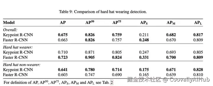 表9的对比结果显示,除APS指标外,Keypoint R-CNN均小幅领先或(AP50指标上)持平Faster R-CNN。类别细分数据表明,性能差异完全源自安全帽非佩戴者的检测效果——这意味着Keypoint R-CNN以牺牲佩戴者检测精度为代价,换取了更均衡的整体表现。