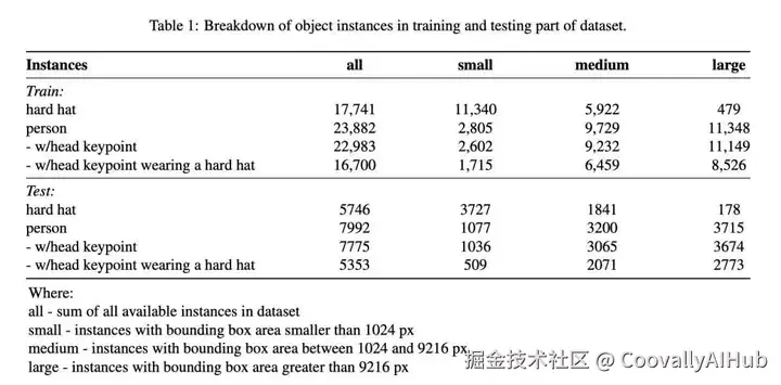 由于现有标注与我们的解决方案不兼容,对安全帽和人头关键点检测进行了标注,这导致了超过5.5万个对象实例以MS COCO格式呈现。训练集和测试集的详细分解,按类别和子类别按边界框面积划分,如表1所示。