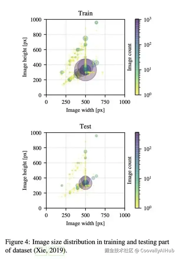 本研究采用公开可用的数据集进行模型训练与测试。该数据集包含7035张不同尺寸的图像,其中训练集包含5269张图像,测试集包含1766张图像。训练集的平均图像尺寸为358×476像素,测试集为360×480像素,其中332×499像素的图像在两部分中均为最大群体。数据集两部分的图像尺寸分布详细情况如图4所示。