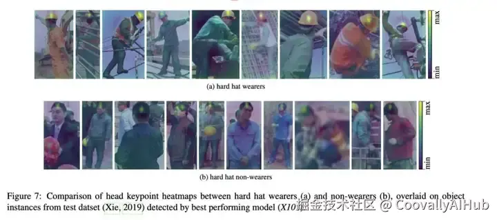 为全面评估方案性能与局限,我们还分析了原始检测结果(图9展示了部分标注实例的图像)。大多数错误源于安全帽或人员检测失败(图9b、c、e)。另一个问题与头部关键点检测相关:研究发现即使头部不可见的实例也会被检测出关键点(图9f),这是由于数据集中此类样本极少导致的。但令人意外的是,系统在极小尺度下仍能准确定位头部关键点(图9c、e),这反而导致新问题——当工人实例尺寸过小时,其对应安全帽尺寸会更小以致无法检测,影响了小尺度下的安全帽佩戴判定。