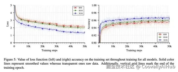 每个模型随后在Xie等(2017)数据集的标注训练集上以批量大小为4进行5万步训练,相当于约38个训练 epoch。采用以下数据增强方法:图像可随机水平翻转、垂直翻转或同时沿两个轴翻转。此外,较短边可随机调整为640、672、704、736、768或800像素。同时,较长边的尺寸不得超过1333像素。图5展示了每个模型在训练步骤中测量的损失函数值和分类准确率。