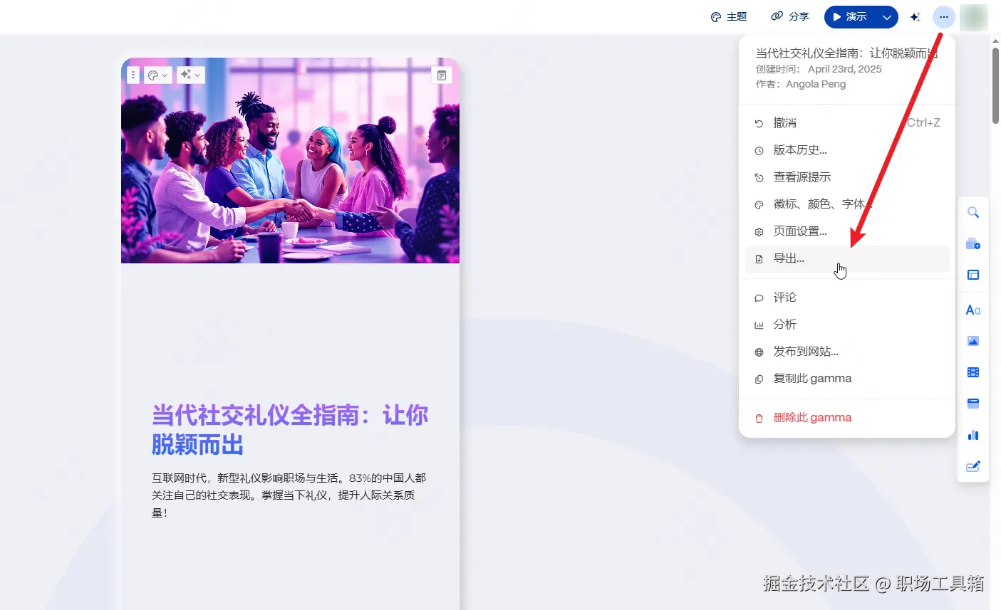 打开Gamma在线编辑器界面,点击右上角的 … ,在弹出的面板选择“导出”,就能将当前文件导出下载为本地的ppt文件。