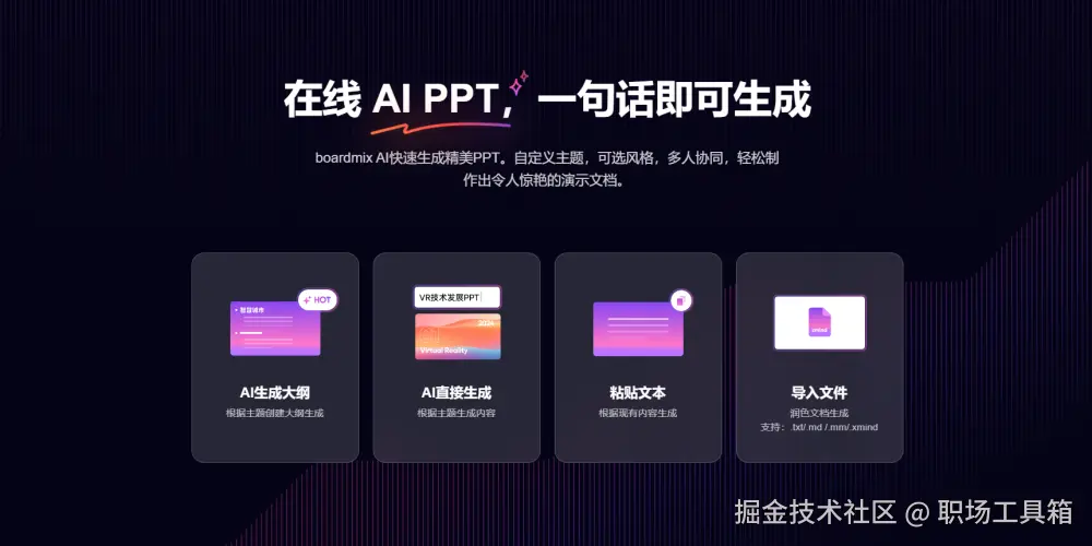 AI在线生成PPT:用户只需输入主题,boardmix AI PPT即可快速生成PPT,大大提高工作效率。