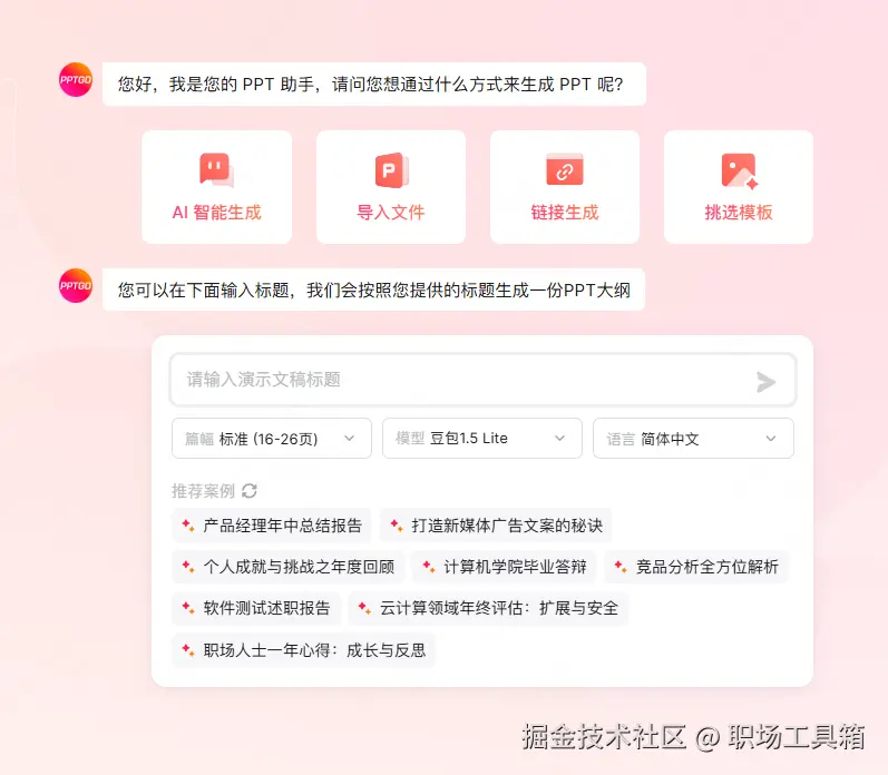 - 链接生成PPT:粘贴文章或内容链接,解析后自动生成高颜值的PPT