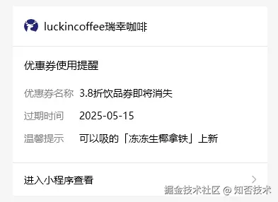 但是在实际场景中,有些企业需要给指定用户发送特定消息。比如瑞幸咖啡给你发送了优惠券、顺丰会员等级变更通知、生活缴费通知、快递物流信息等等