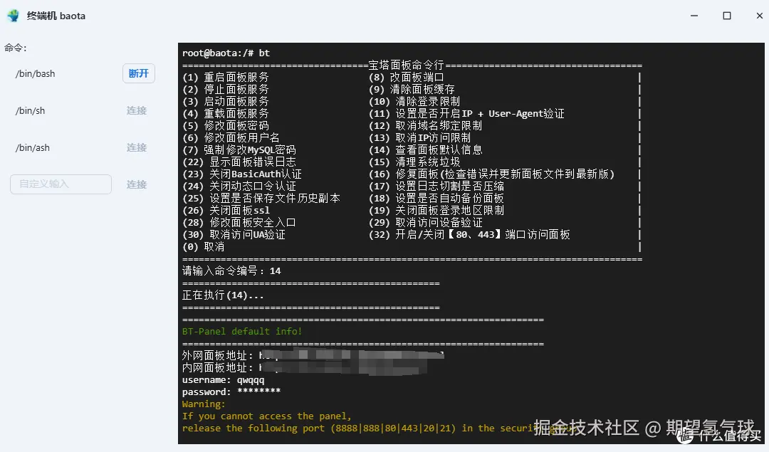 当我再次启动宝塔面板时,傻眼了 无法登录shell中查看发现用户名密码都成了默认的 - 登录之后所有数据都已经丢失!是的,全部消失了!我辛辛苦苦配置的网站、数据库、各种设置,一夜回到解放前。那一刻,我感到一阵深深的无力感。