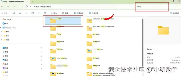步骤1: 双击打开【此电脑】,在里面找到照片存储的硬盘,打开后右上角搜索【temp】,等待搜索结果;