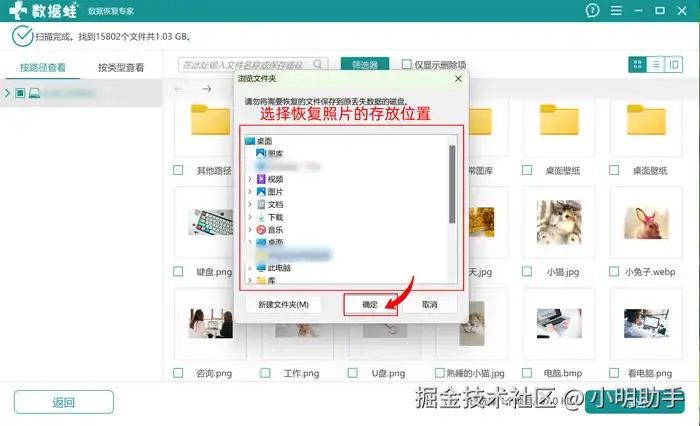 步骤3: 点击【导出】后还没结束,还需要选择恢复文件的存放位置,选好后单击【确定】。