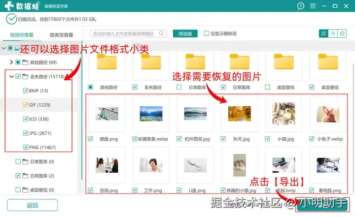 步骤2: 在扫描文件后,在扫描出来的文件中选出自己需要恢复的照片(可恢复图片会有缩略图显示),选中后点击右下角的【导出】;