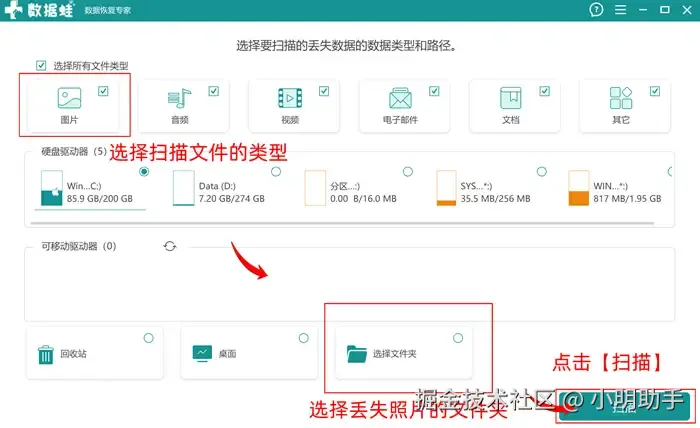 步骤1: 打开软件的页面,在页面的上方选择文件类型,如【图片】;再选择误删照片的位置,然后点击右下方,开始扫描;