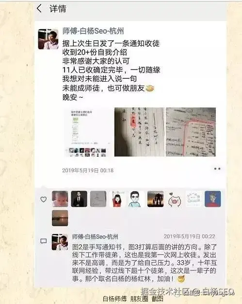 然后也是在这一年开启网站SEO师徒培训,总共四期最终招了22个徒弟。因为在第三期因为自己审核不严,有个众筹学习的学员把我的课拿出去卖9.9元伤了我的心,所以就第四期结束后说不再做网站SEO一对多培训,同时说也不再收徒弟。