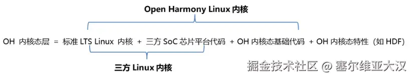 如下图所示,OpenHarmony 内核层主要包含OH Linux内核、OH内核态特性。其中OH Linux内核可以看成是由三方Linux内核+OH内核态基础代码的组成。