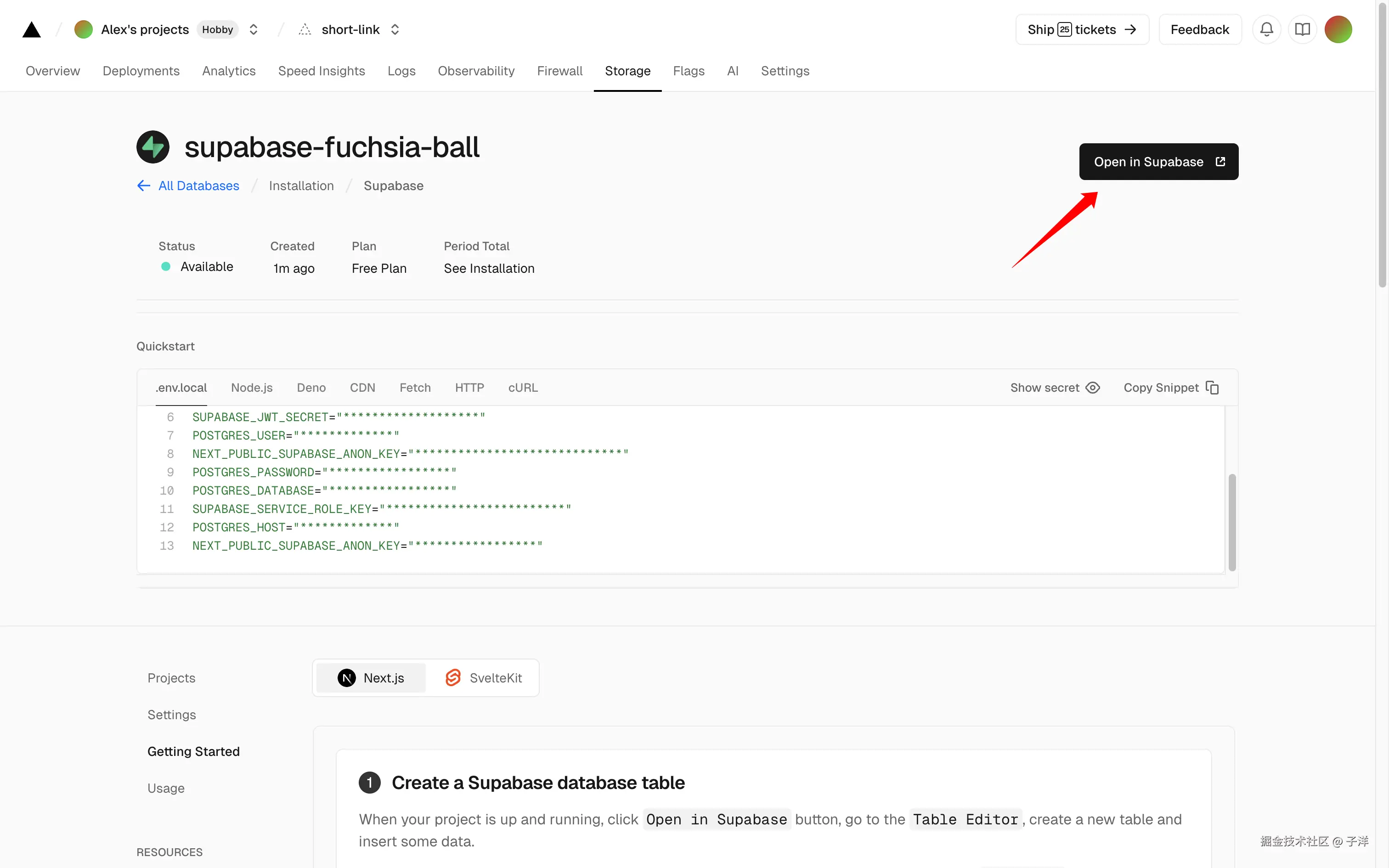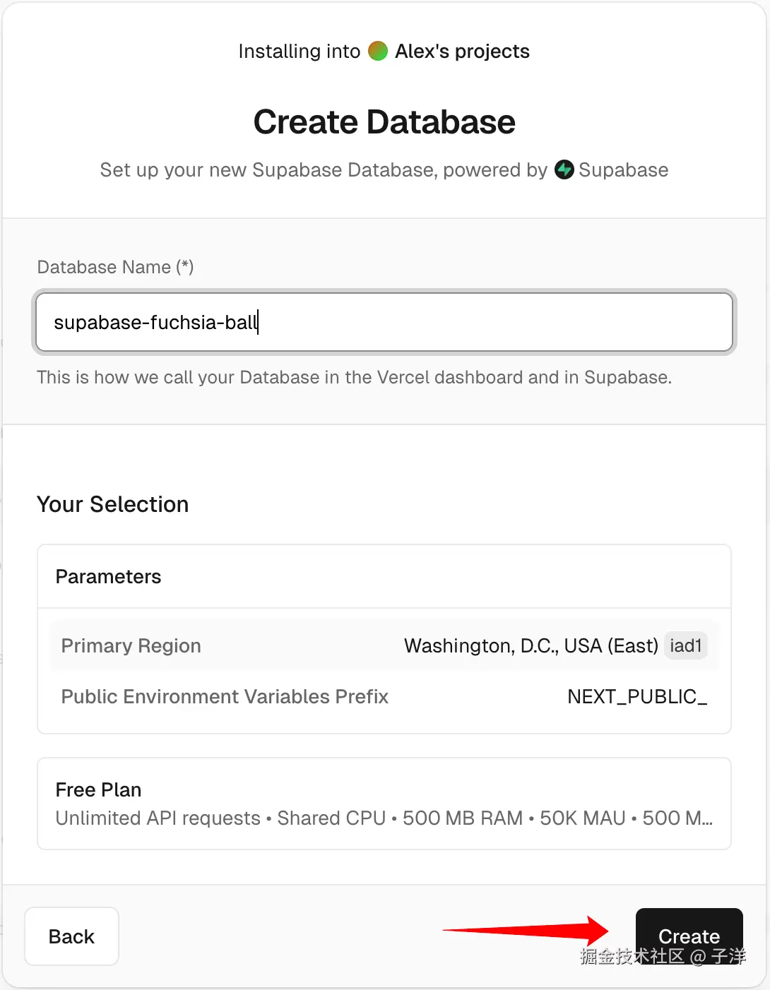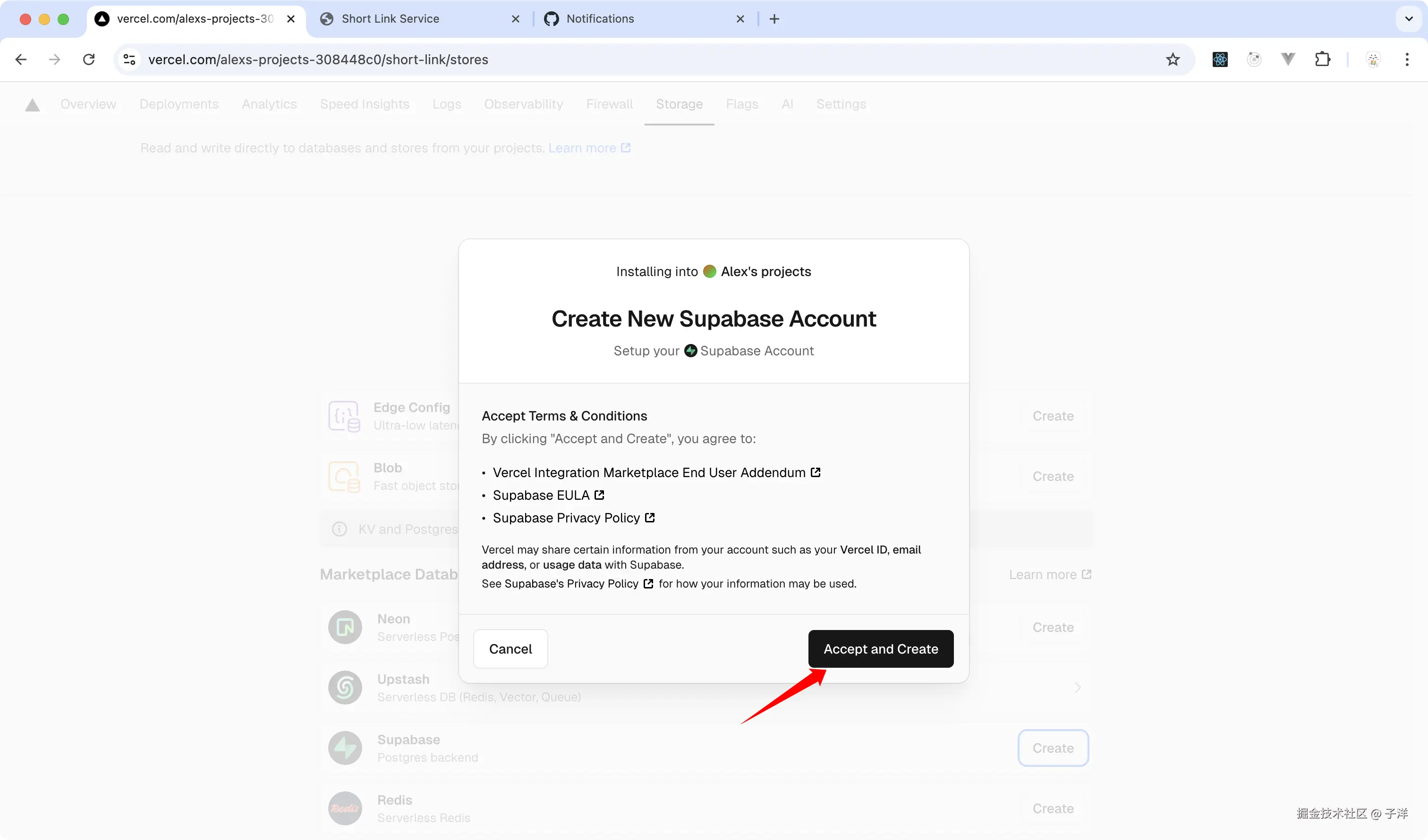 选择Supabase,点击"Create"