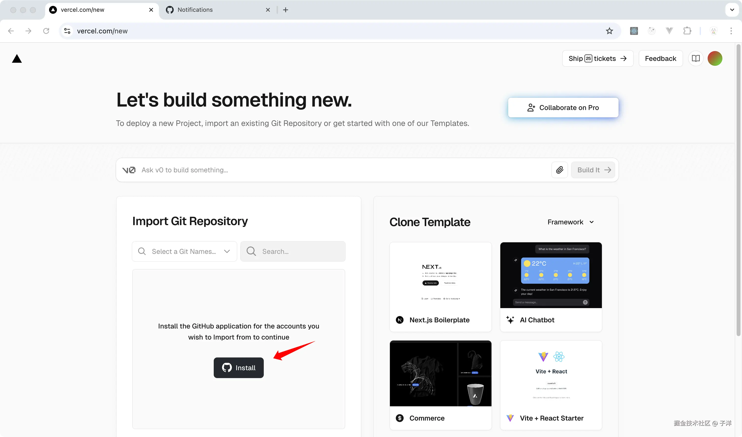 - 如果是首次使用,需要安装Vercel的GitHub应用。点击"Install"完成安装