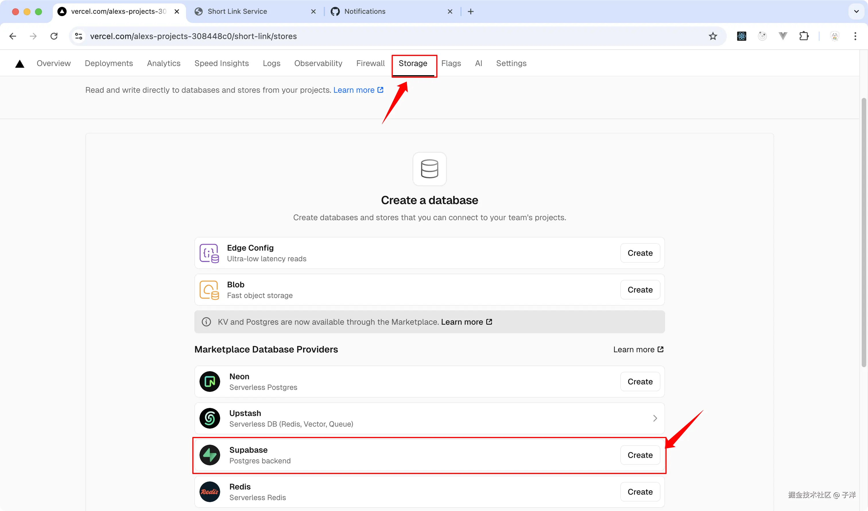 在Vercel项目页面,点击"Storage"选项卡