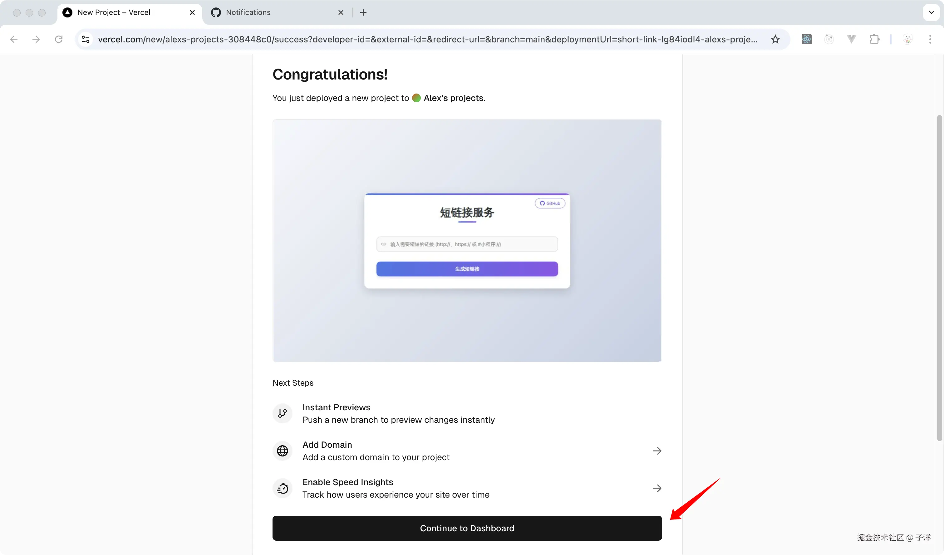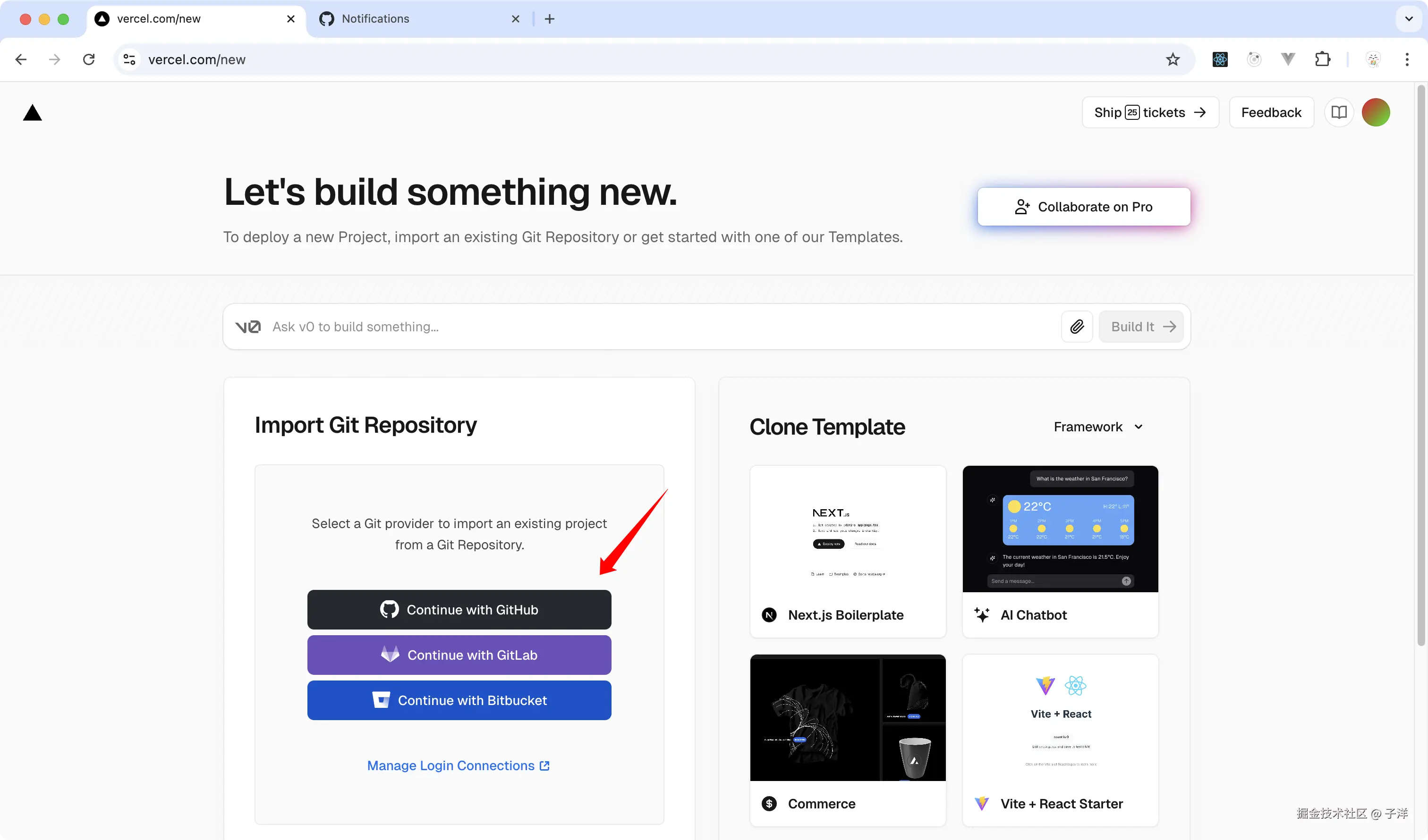 - 点击"Continue with GitHub"并授权Vercel访问你的GitHub账号