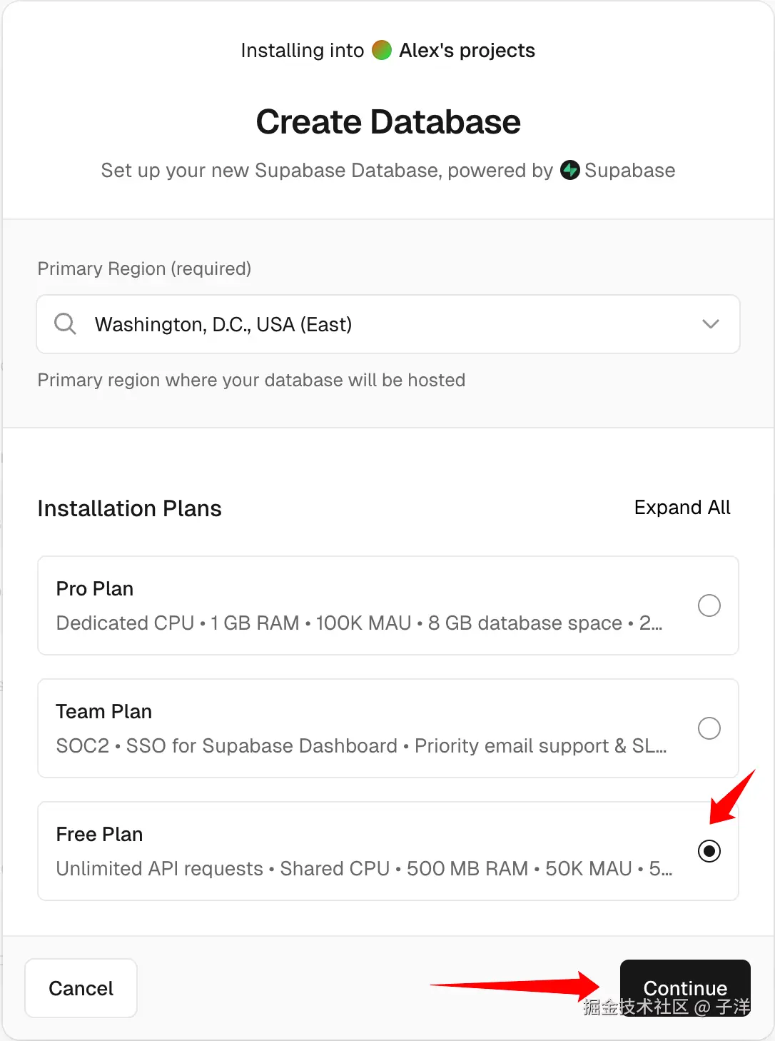 - 选择"Free Plan"免费计划,点击"Continue"