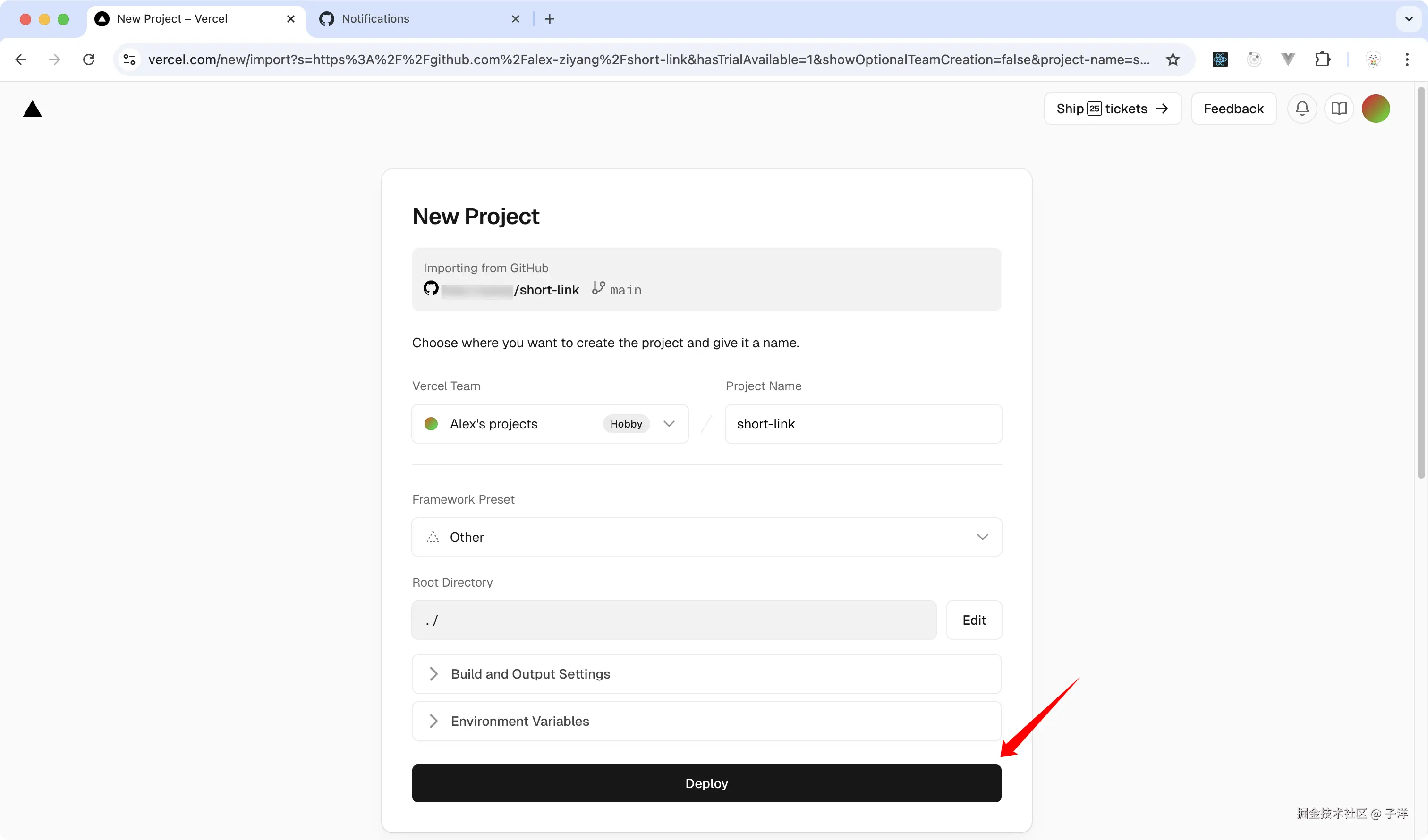 - 安装完成后,在项目列表中找到你fork的"short-link"项目,点击"Import"