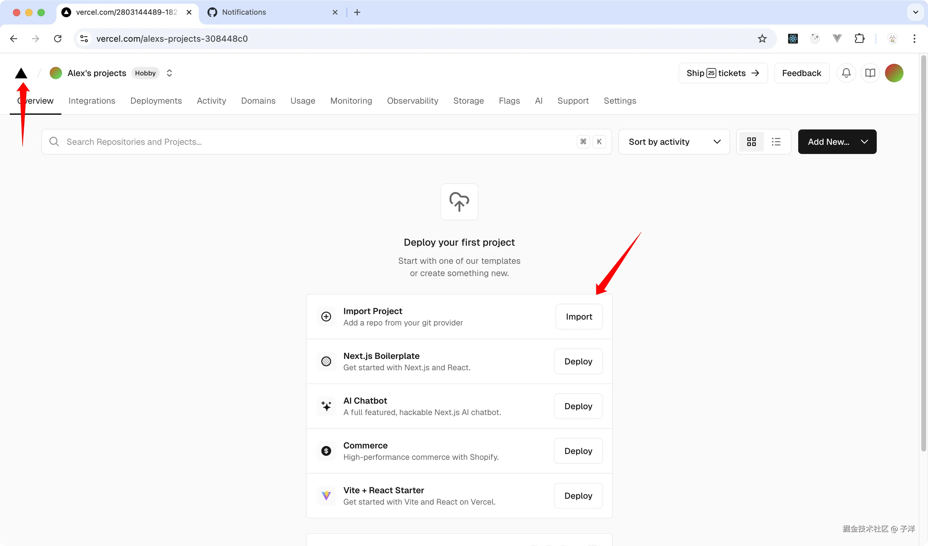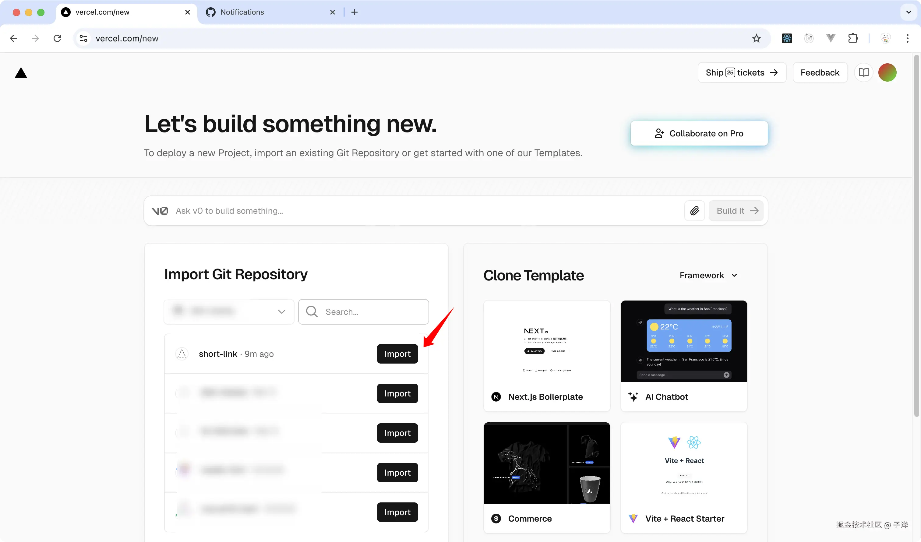 - 登录Vercel后,点击左上角菜单,选择"Import Project"